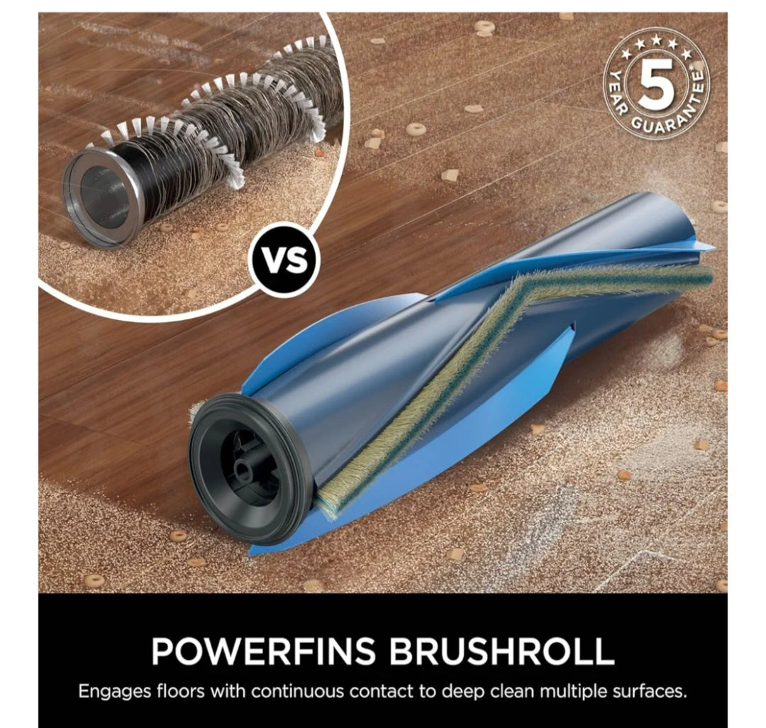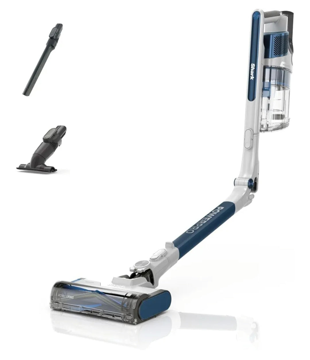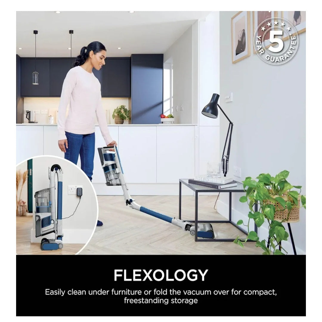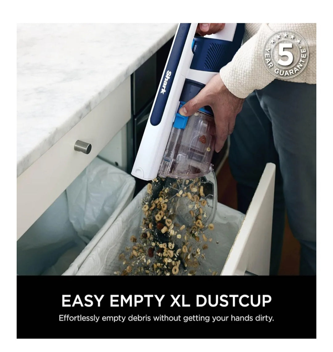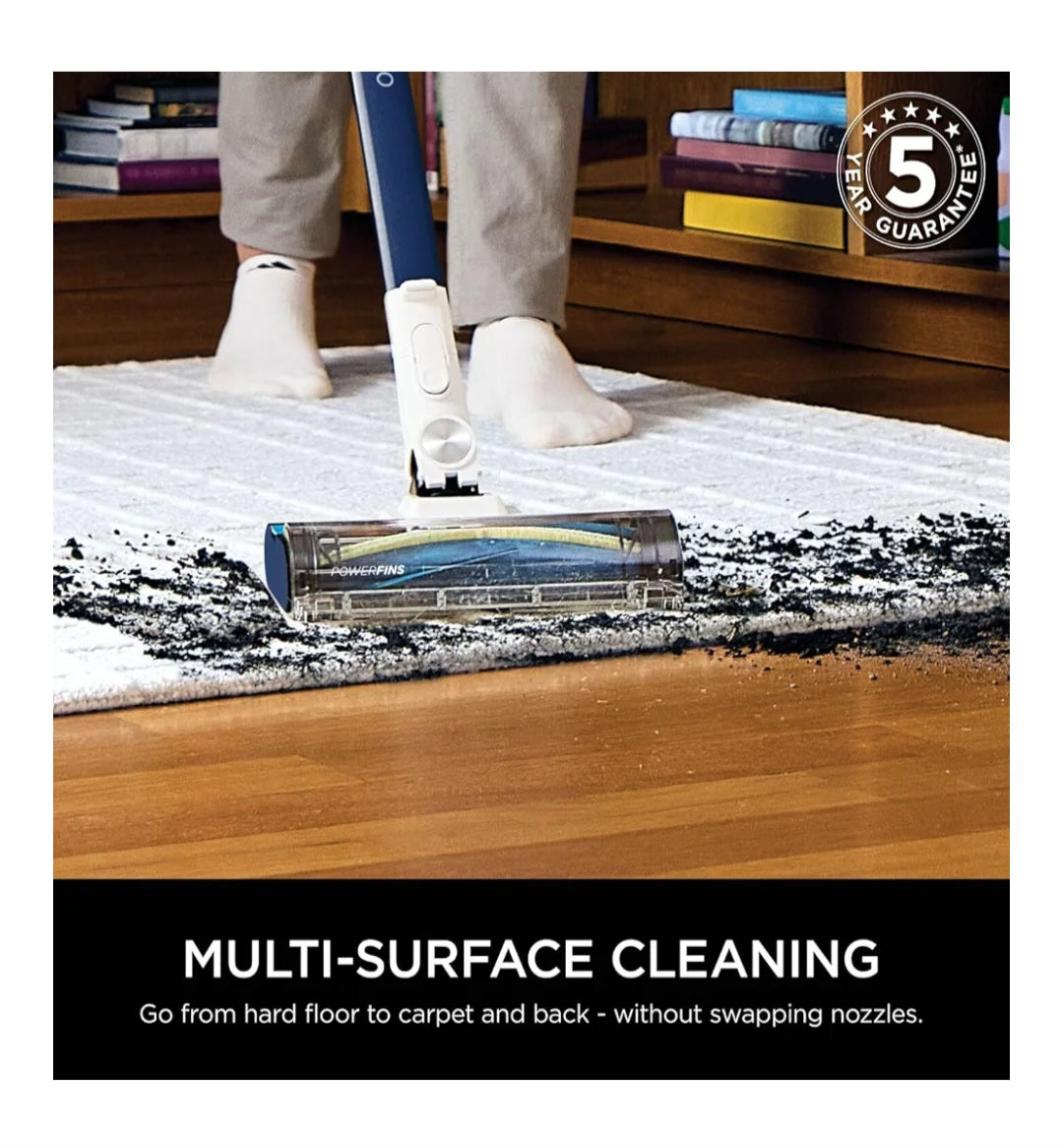 INCLUDES: Tool, Crevice Tool, Upholstery Tool. DIMENSIONS: H:114.3cm x W:31.6cm x D 26.4cm. Weight: 5.68kg. Colour: Navy Metallic. 5-year guarantee (upon registration with Shark, 2 years for batteries)